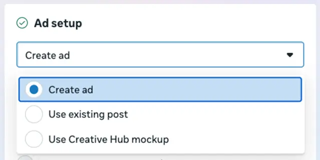 When you create a new ad on Facebook, you can choose to create a new ad from scratch, use an existing post, or use a mockup you made in Creative Hub.