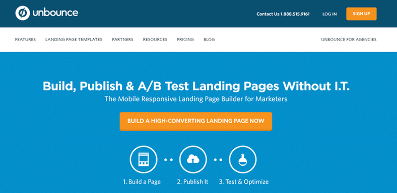 As you might expect from a company specializing in conversion rate optimization, Unbounce’s value proposition is abundantly clear from the moment you arrive on the homepage, namely the ability to build, publish, and test landing pages without any I.T. support. For many small businesses (and even larger companies), the perceived technical overhead of A/B testing is a major barrier to entry, making Unbounce’s value proposition particularly appealing.